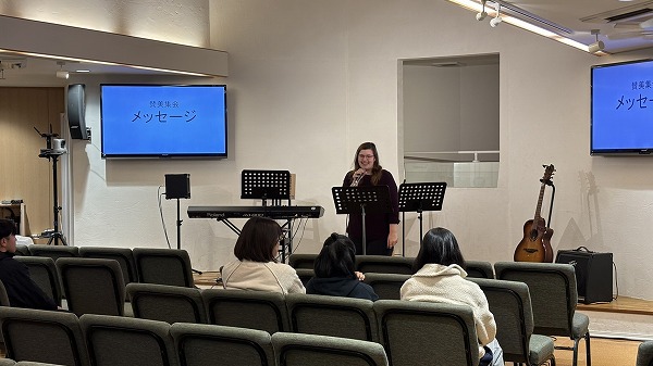 | 6/22(日):午後からは大野チャペルで キンバリー姉が証をしてくださいました。 これまで9カ月のお働きに感謝します。 |