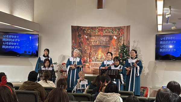 | 12/14(日):夕方からは英会話クラス、ウクレレクラス、ゴスペル、 英語礼拝と合同でクリスマスキャロリングのイベントがありました。 150名程の方々が集まりクリスマスの本当の意味を知る 素晴らしい時となりました。 |