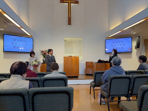| 3/30(日):将司先生が就任されてから20年が経ち、 感謝の時を礼拝後に持ちました。 これまでの尊いお働きに感謝いたします。 |