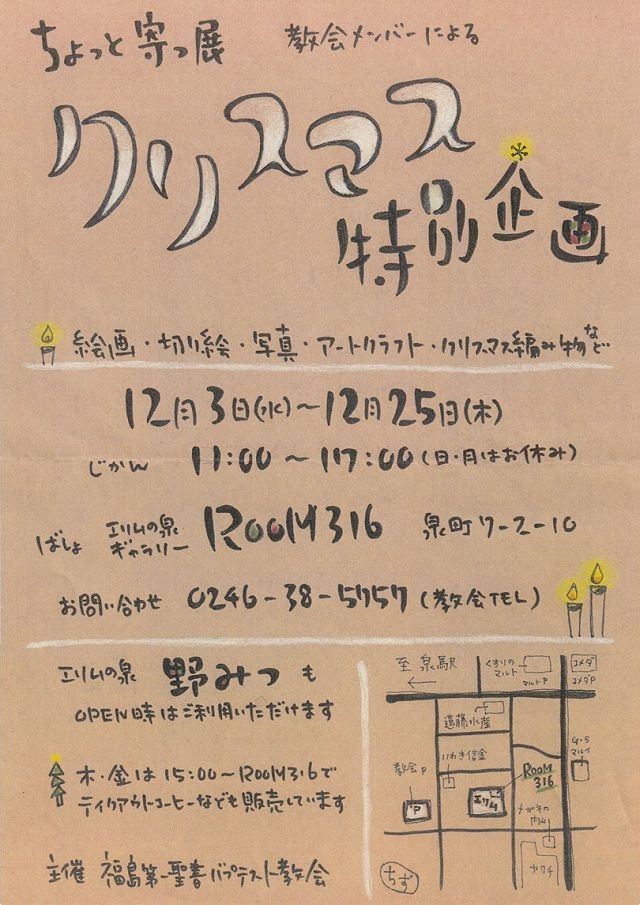 | 皆様のお祈りとご支援に感謝いたします。ご存知のように、私たちの教会は2011年3月11日の震災にあいました。福島県大熊町にあった教会堂は閉鎖となり、教会員は住む場所を失い各地の避難所や親戚のところを転々としましたが、神様のいつくしみと皆様のお祈り・ご支援に支えられて2013年同県いわき市泉に新しいチャペルが与えられました。癒えない震災の傷はあり、多くの教会員が全国に散らされたままではありますが、最善以下をなさらない神様のみつばさにかくまわれ、皆が幸いな毎日をいただいています。 どうか引き続き熱いお祈りをお願いします。 |